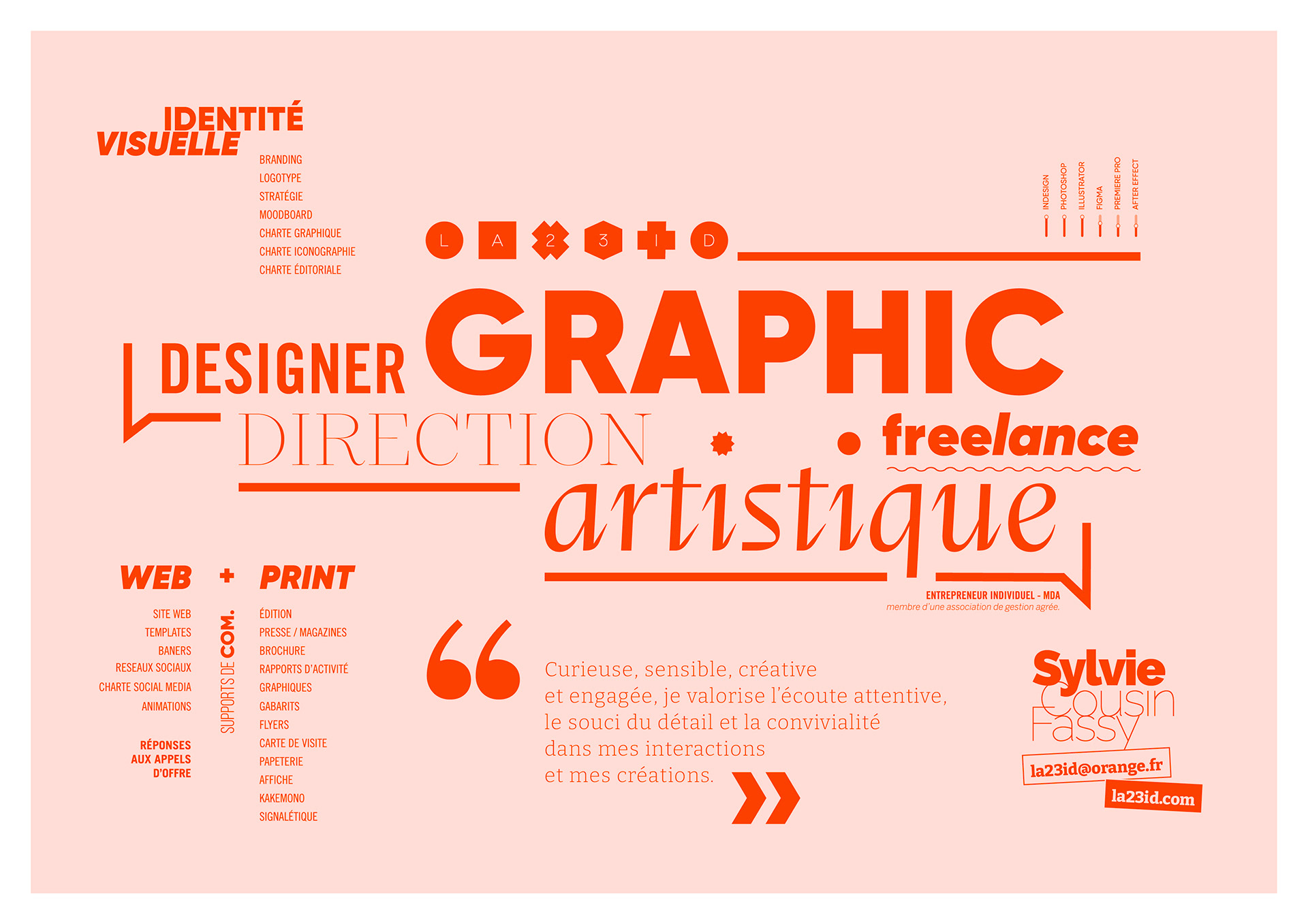 Ce parcours m'a permis de développer des compétences transversales en création pour des secteurs variés — institutionnels, associatifs et privés — dans le cadre d'événements publics, promotionnels ou publicitaires, ainsi qu'une expertise technique en print et en digital (e-commerce, sites web, réseaux sociaux…).