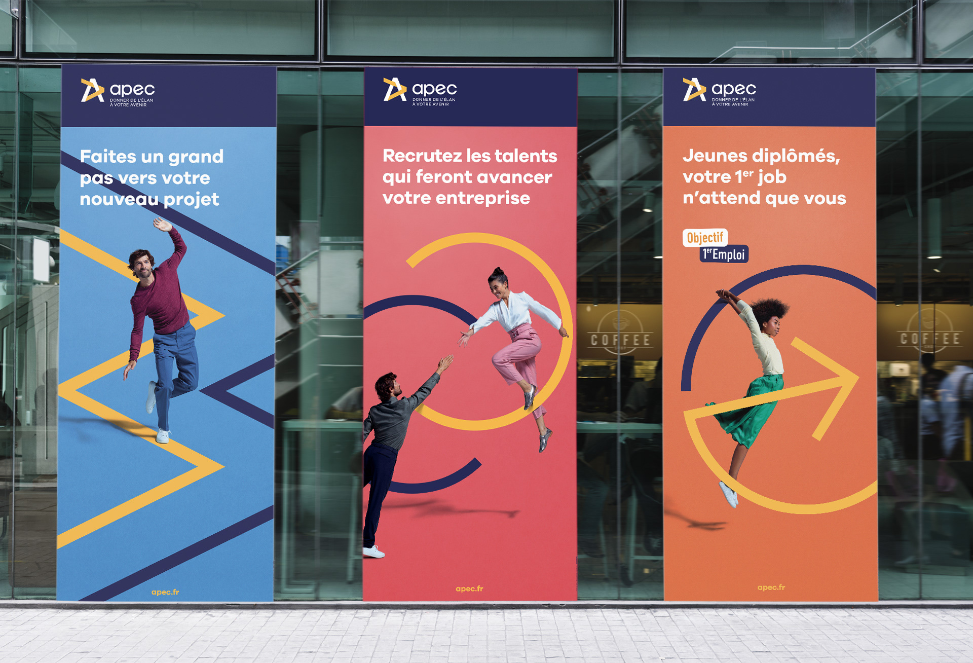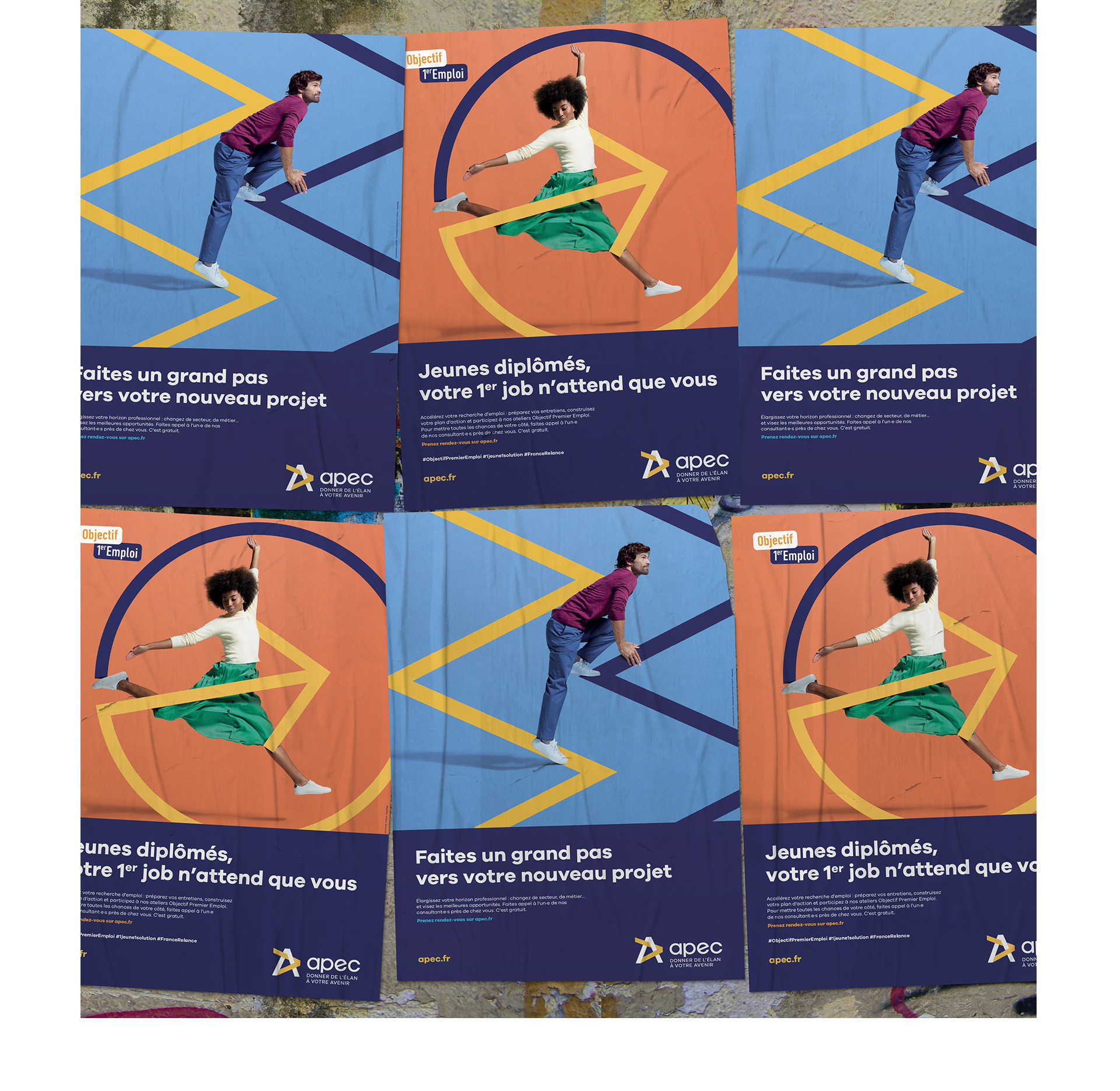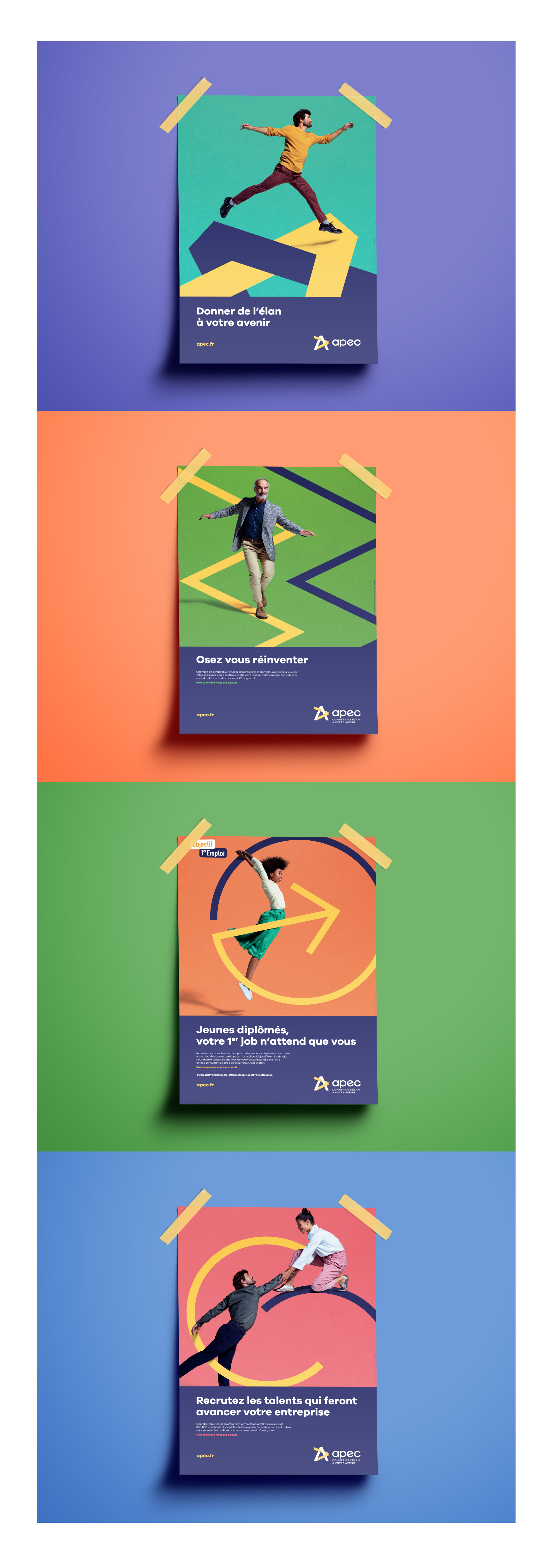 Aux lendemains de la crise du Covid-19 qui bouleverse les marchés, l'emploi et le monde du travail, comment valoriser l’accompagnement des conseillers de l’Apec pour aider chacun à rebondir et aller de l’avant ? Création de visuels aux couleurs vibrantes mettant en scène des personnes en mouvement, prêtes à saisir de nouvelles opportunités. Face à la crainte de stagner dans sa vie professionnelle, nous montrons des individus pleins d’élan, qui osent franchir le pas vers un avenir plus prometteur. Chaque image illustre un passage à l’action, incarnant l’énergie et la confiance que l’Apec insuffle à ceux qui souhaitent évoluer.