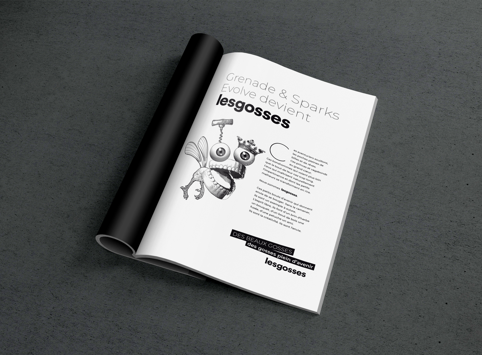 Comment traduire visuellement la nouvelle identité desgosses, une agence créative parisienne née de la fusion de plusieurs entités aux expertises variées ? Conception d’un bestiaire hybride aux codes rétro, reflet de l’ADN de l’agence : impertinent, aventurier, rêveur, joueur et débordant d’imagination. Chaque créature incarne la diversité des talents et l’alchimie des esprits qui composent lesgosses, illustrant une créativité sans limite et un goût assumé pour l’audace.